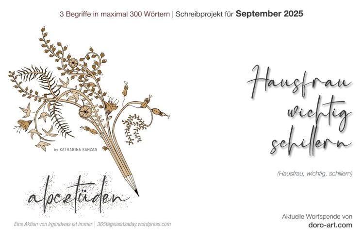 Hier geht es zu Christianes Schreibeinladung für die September Etüden und die Wortspende kommt dieses Mal von Doro. Es handelt sich um die Wörter: Hausfrau, schillern & wichtig. Die Etüden-Regeln sind wie gehabt: 3 Begriffe in maximal 300 Wörter verpacken, Thema egal.